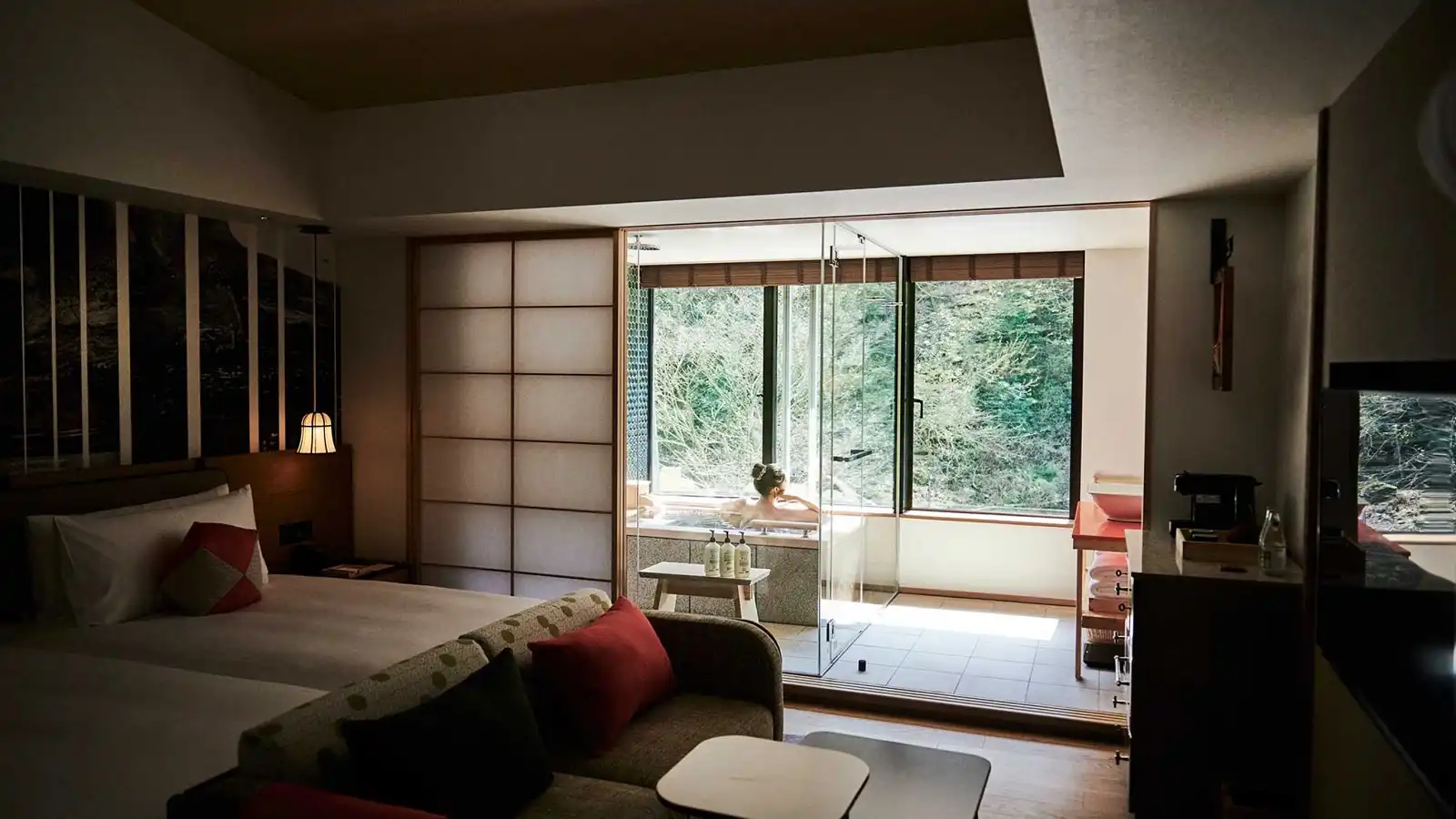 This 37 sqm room blends contemporary style with Hakone-inspired heritage. The room features a separate onsen bath tub with natural hot spring water, along with modern comforts like smart technology and a warm, relaxing interior.