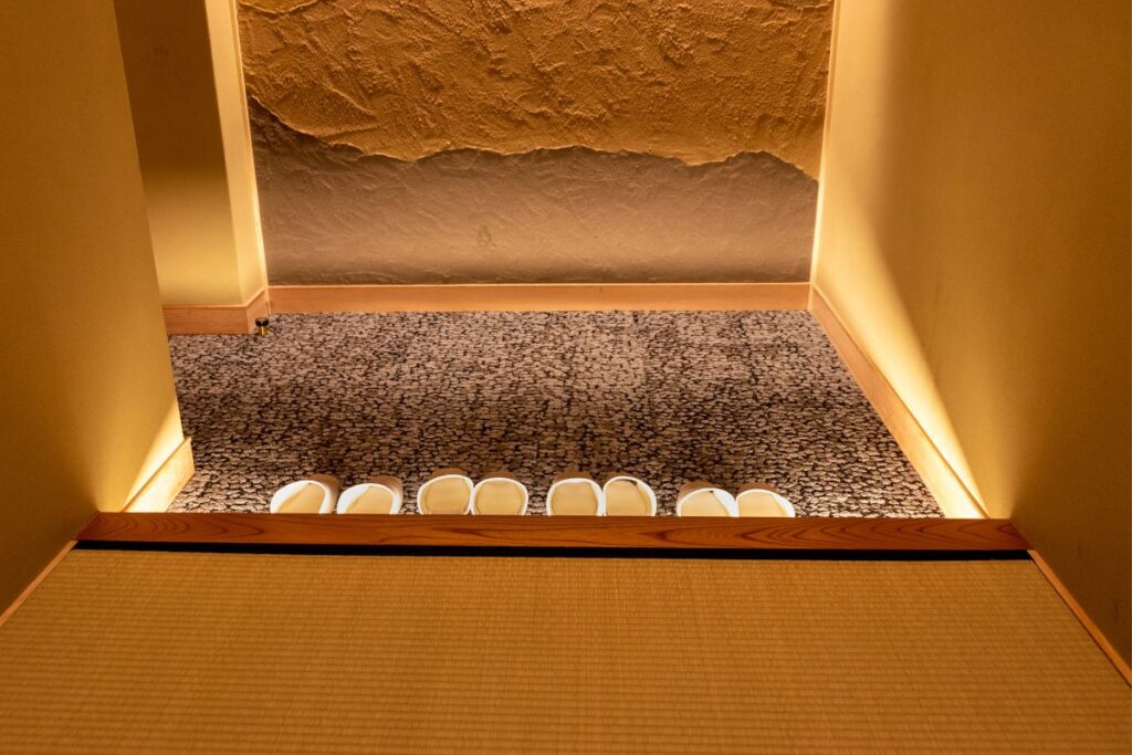 Most inns have a small entrance space with wooden flooring before the tatami room, so take off your slippers before stepping onto the tatami.