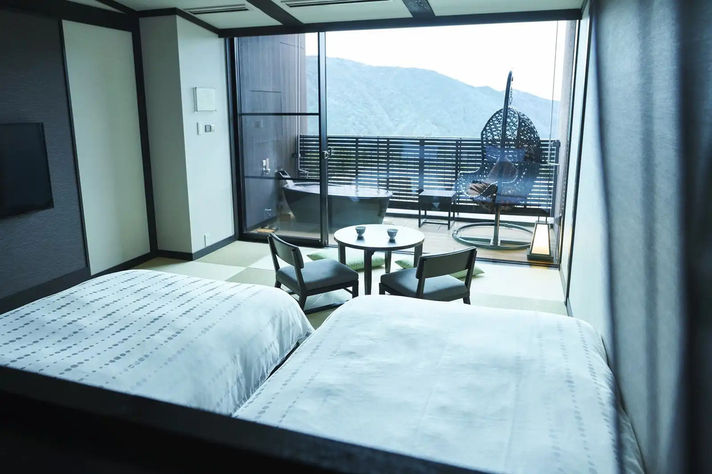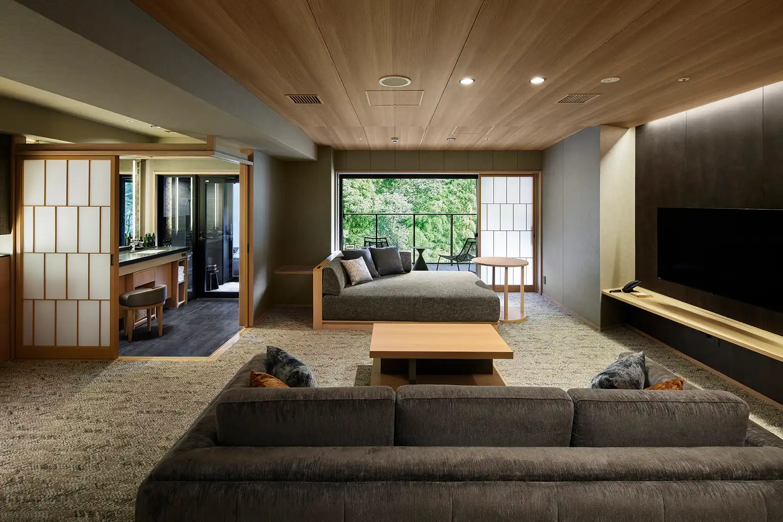 The guest rooms have ample area and a spacious feel. The view from the open-air bath is on a grand scale, and time spent soaking in the onsen will likely fly by. Large furniture is placed in the rooms, making them not only a relaxing space to unwind but also highly functional and ideal for remote work.