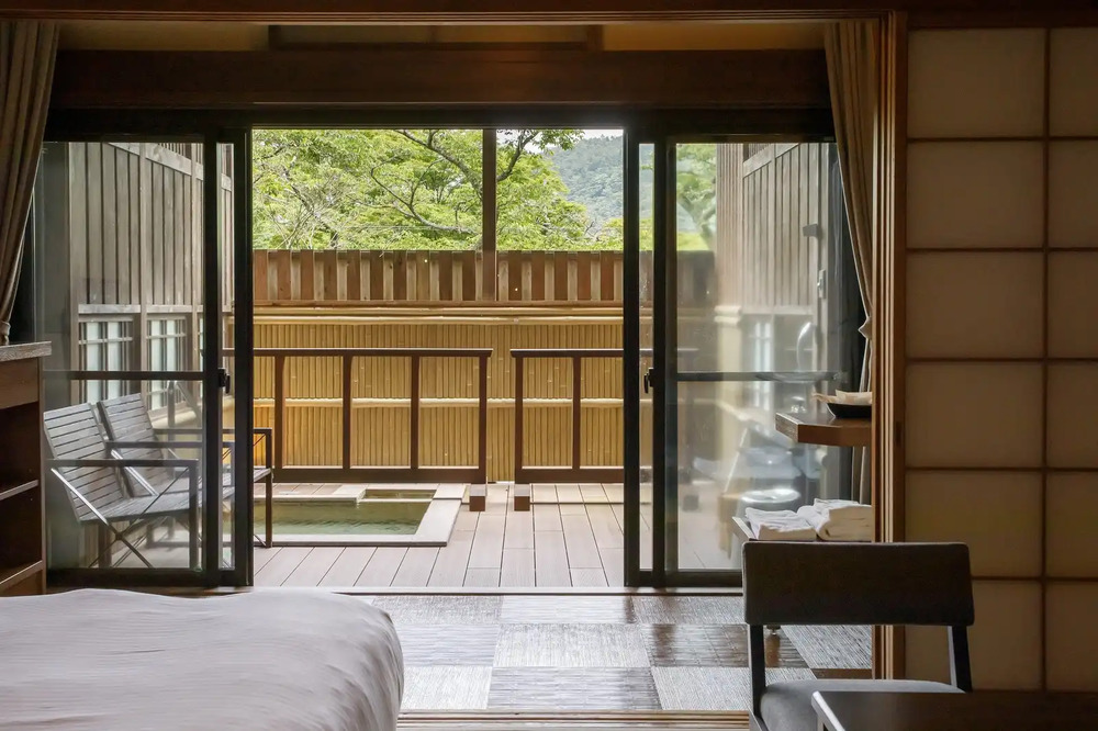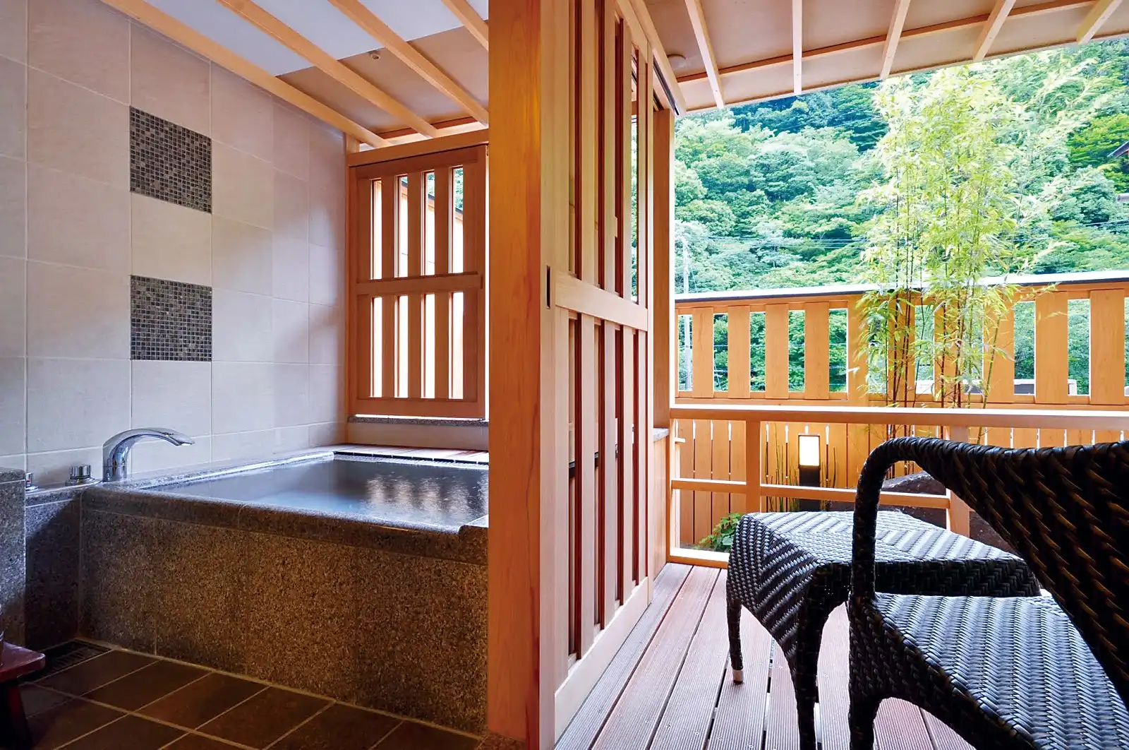 Hakone Kowakudani is overflowing with greenery. "Hakone Kowakudani Onsen Mizu no To," an inn with rooms featuring open-air baths, is a hotel where you can enjoy the sound of water, just as its name suggests, amid the tranquility.