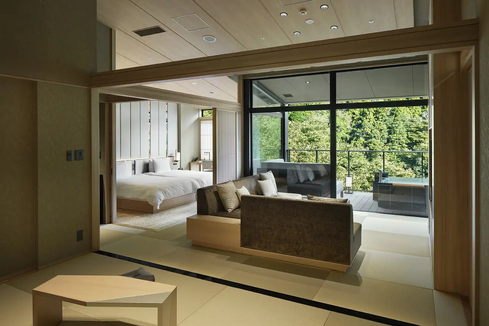 Japanese-modern interiors and an artistic space. "Kitanokaze Saryo" in Sengokuhara is an auberge where every guest room has an open-air bath.