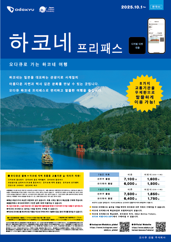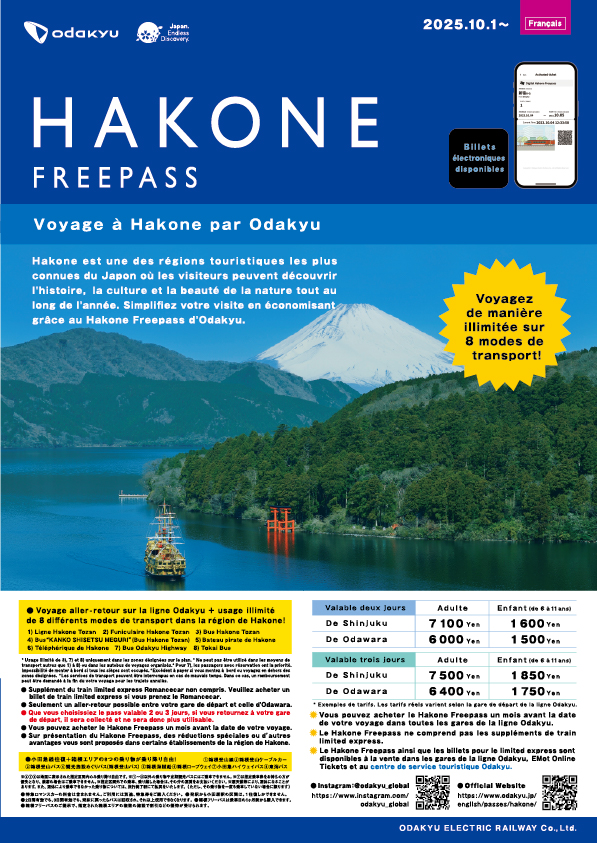 The Hakone Freepass, the Enoshima-Kamakura Freepass, the Tanzawa-Oyama Freepass and tickets for Odakyu Lines can be purchased from ticket vending machines at stations and online. Passes such as the Fuji Hakone Pass cannot be purchased from a ticket vending machine or online and some passes are available only at Odakyu Sightseeing Service Centers.