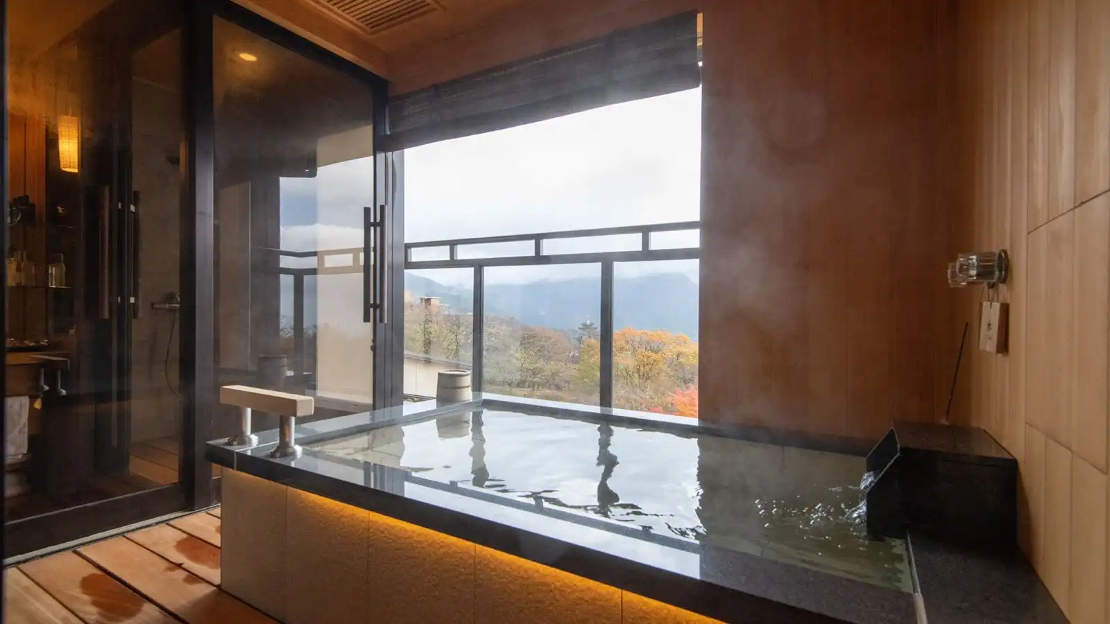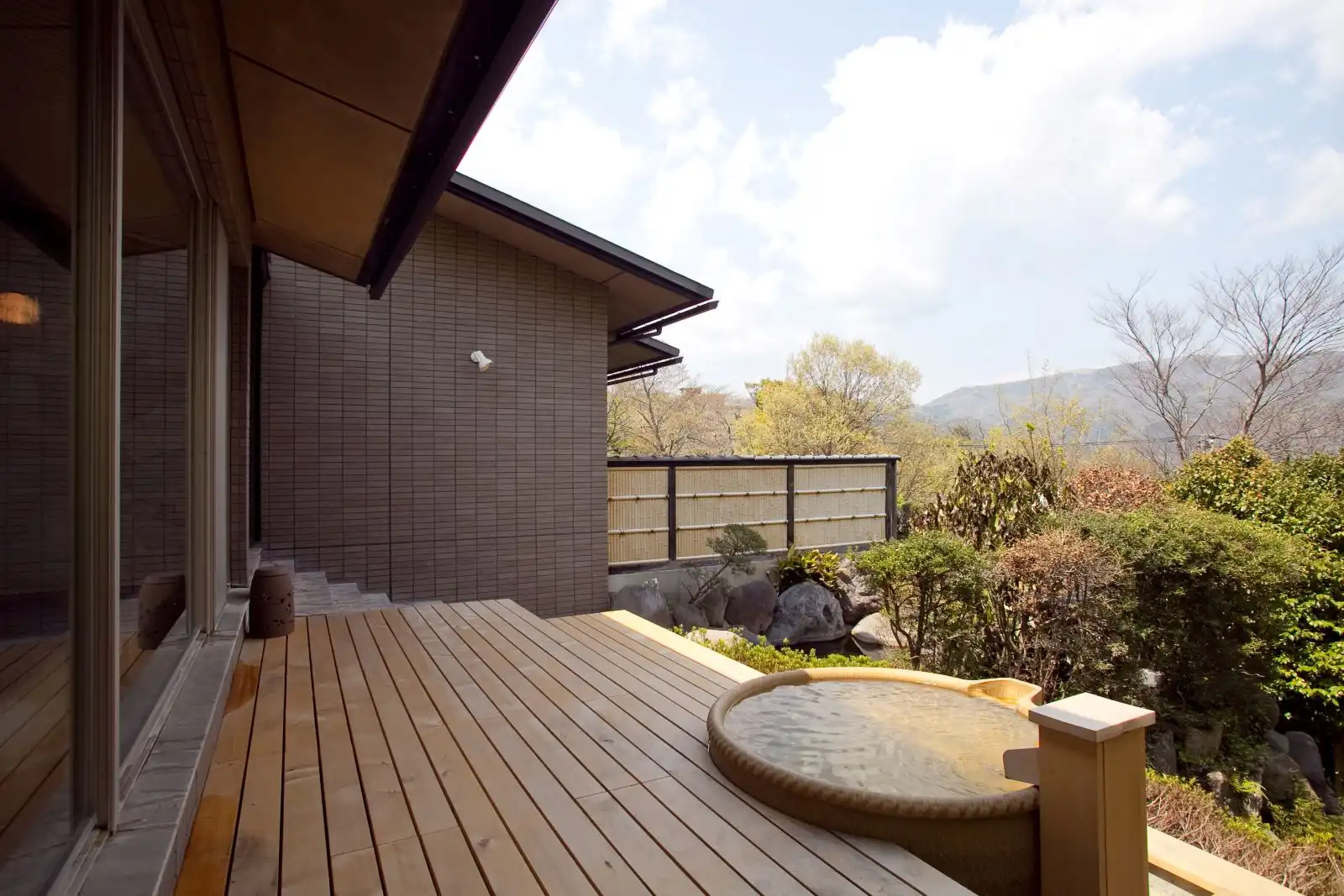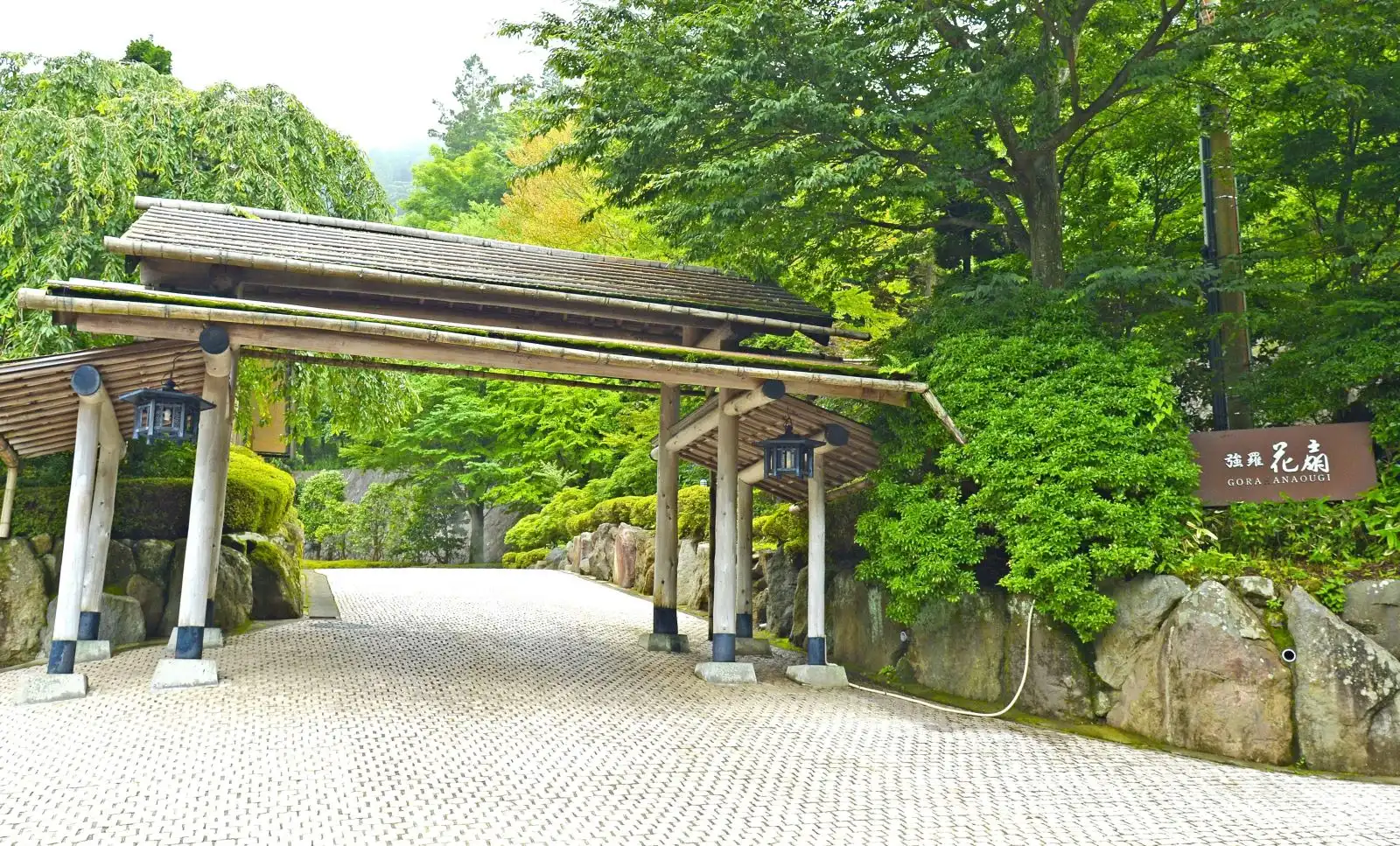 Gora Hanaougi is a luxurious ryokan in the Gora area, where every guestroom is equipped with a private open-air bath fed by its own hot spring source. The interior features tatami flooring throughout, with abundant use of keyaki (zelkova) wood, filling the space with a natural fragrance. Guests can relax in privacy while admiring panoramic views of the Hakone mountains. Dinner showcases elegant Kyoto-style kaiseki cuisine prepared with carefully selected seasonal ingredients. With soothing onsen and refined hospitality, Gora Hanaougi offers an exceptional retreat.