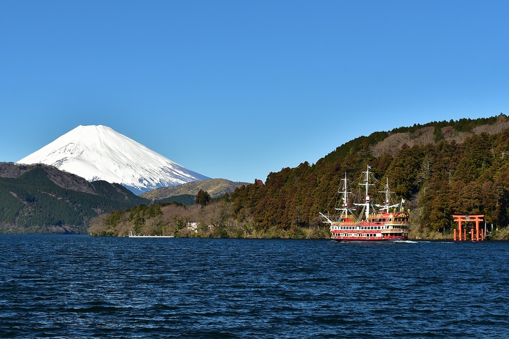 「蘆之湖」是能在天氣晴朗時遠眺富士山的絕佳景點。湖畔矗立在水面的「箱根神社」鳥居更是著名的攝影打卡地點,帶有一絲神秘氣息。
