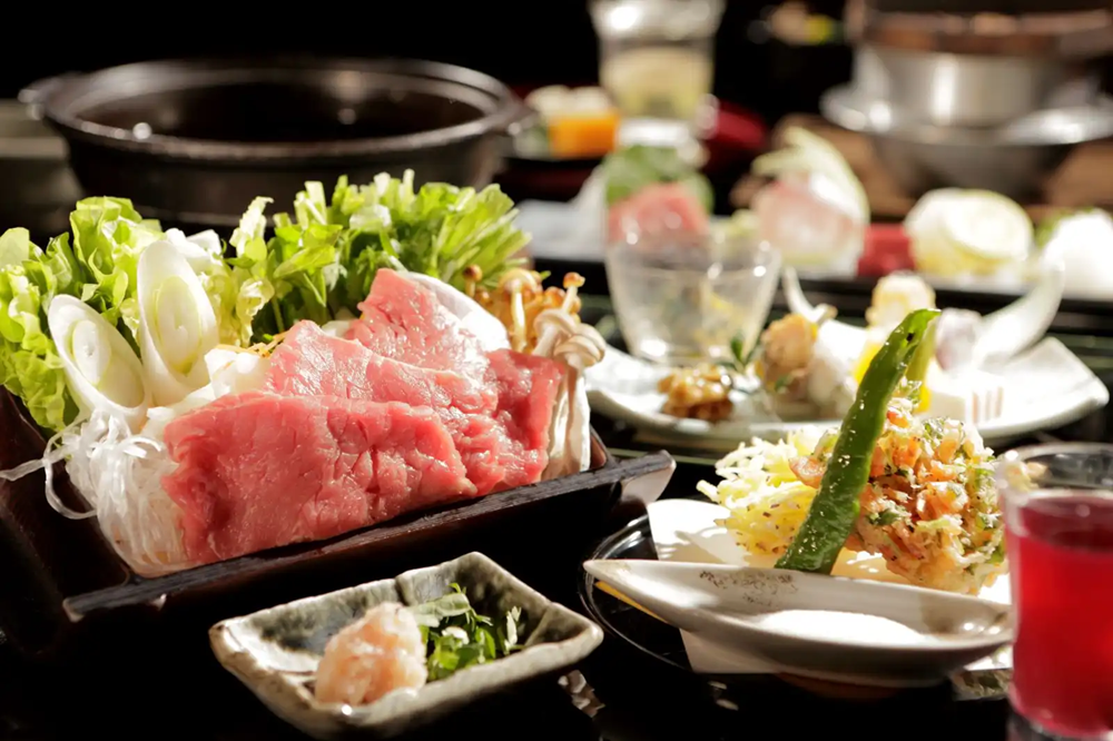 「足柄遊膳會席」則以奢華運用時令食材、呈現細膩手工的多道料理為特色。主菜為每人一份的小火鍋,可從牛肉、豬肉、鴨肉中任選其一。