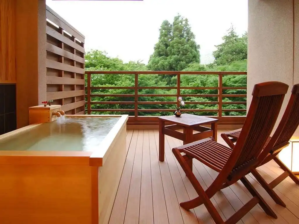 附設露天風呂的和洋室,融合了和式的放鬆感與西式的舒適度,並設有開放感十足的露台。非常適合紀念日等特別日子,或是想稍微奢華一下的旅客。無論是在露天風呂或露台,都能獨享箱根四季的自然景色,盡情沉浸在非日常的度假氛圍中。