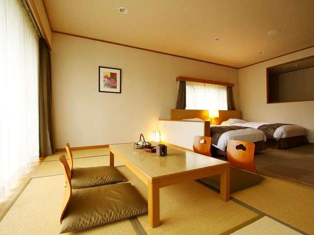 和洋室以沉穩溫馨的氛圍為特色,從寬大的窗戶可眺望外頭的豐富自然景觀。除了設有榻榻米空間與床鋪外,房內還備有小廚房,功能性十足。最多可入住 5 人,非常適合家庭旅客或團體同行。