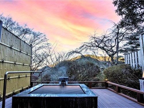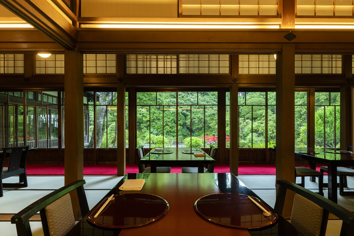 宛若佛寺神社般具有裝飾效果的屋頂與採用獨具特色的構造(呈弧形的唐破風九脊頂)的正門歡迎顧客的光臨。自1883年創立以來,竹久夢二和與謝野晶子等畫家和文人,以及中國革命之父孫文都曾下榻過這家旅館,採用日本傳統建築風格的優美的本館被指定為國家註冊有形文化財產。每間客房的設計意趣各異,既有能夠透過窗戶觀賞櫻花的客房,也有設有露天浴池的客房。此外,從旅館內的酒廊(lounge)還可以眺望宏大的庭園與箱根山脈的景色,白天作為咖啡廳營業,顧客可以在此享用抹茶和日式點心等。在這裡可以盡情品鑑歷史悠久的建築物,還能飽覽優美的景色。