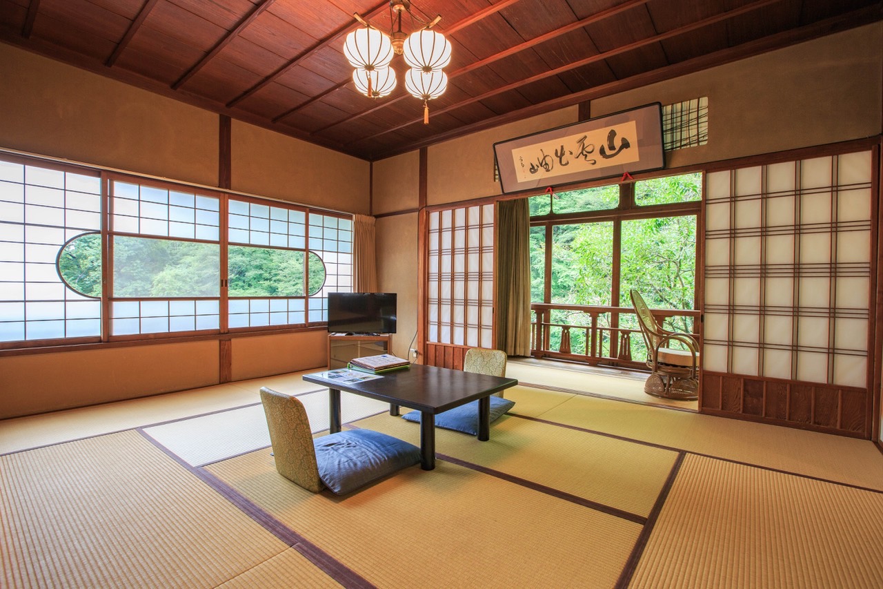 在專有屬地內建有被指定為國家註冊有形文化財產的本館、別館和(獨立於主建築的)副館。本館內設有4間日式客房,住客能夠充分感受古老而美妙的日本高級旅館的雅致風情,其中還有帶露天浴池的客房。別館內有5間陽台上設有露天浴池的客房、2間相臨房間僅以隔扇推門間隔的融合日式與西式風格的套房型客房以及9間標準型客房;副館設有4間意趣各異的日式客房,其中還有可以眺望庭園的帶露天浴池的客房。如果入住沒有露天浴池的客房,可享用旅館內的源泉掛留型露天溫泉和室內溫泉。所有餐食都採用在餐廳內享用的方式。