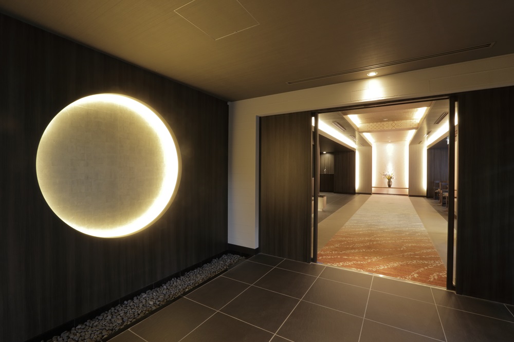 踏入館內,最先映入眼簾的便是一座大型滿月裝飾。這道燈光裝置從正面看像滿月、從側面看則宛如弦月,是旅館的象徵性設計。櫃檯後方的牆面到天花板,則以華麗的寄木細工圖樣妝點,展現十足的和風雅緻。