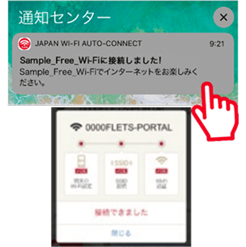 - 02當您在所用終端上啟動瀏覽器時,會出現Free Wi-Fi連線介面,請選擇[連線網際網路]。※若未顯示連線介面,如從書籤等訪問網頁,就會顯示。